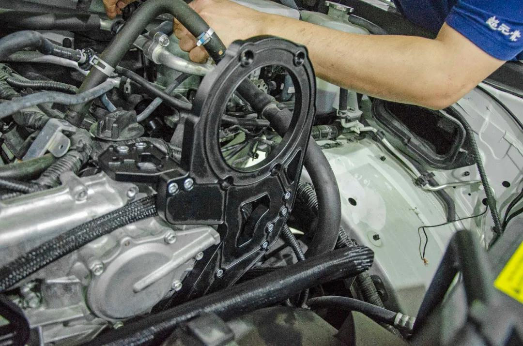 固定好增压器本体,我们还需要安装惰轮和更换发动机原车皮带并进行新的皮带绕法以保证增压器的正常运行。