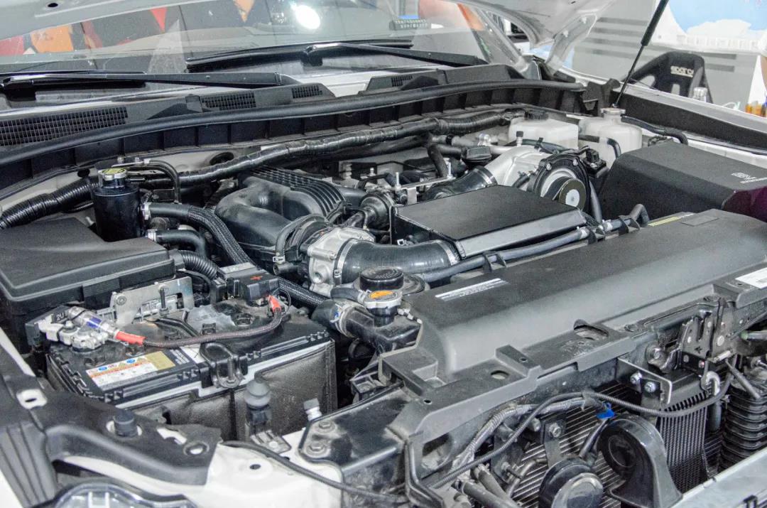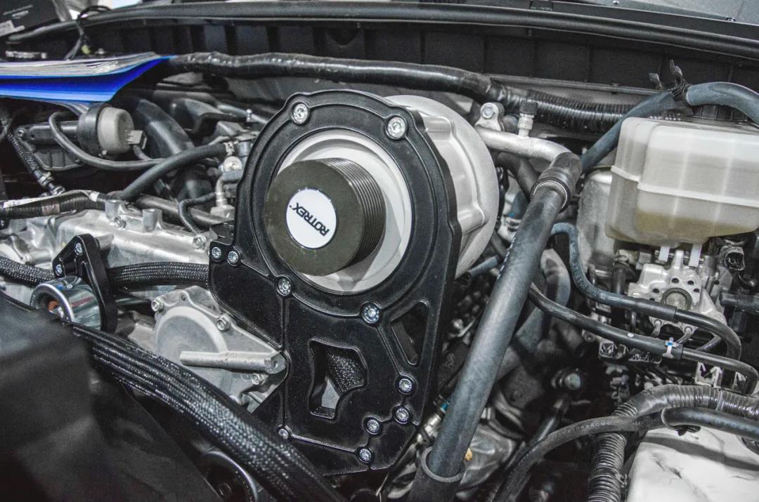 原车的发动机舱。偌大的空间被各个零件整整齐齐地填满了。那么加装机械增压套件后有什么样的变化还请看下文哦!